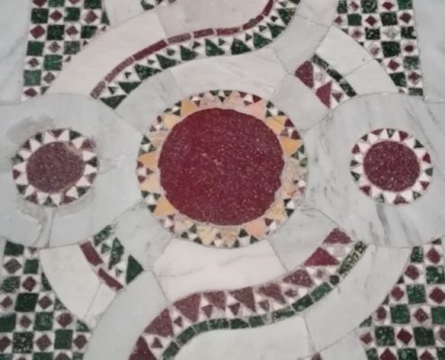 The most beautiful cloisters and ground floors in Rome’s Basilicas -and its region Lazio – are remarked by circles of polychrome marbles – often recovered in ancient roman constructions – enclosed by long lines of white marbles creating the effect of a “carpet” that leads the pilgrim to the main altarpiece.